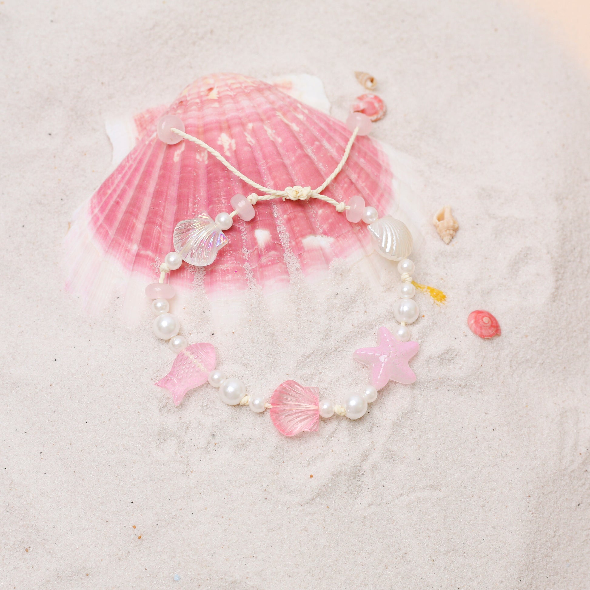 Featuring delicate faux pearls, shimmering seashell charms, and soft pink acrylic stars, this piece brings coastal magic right to your wrist.