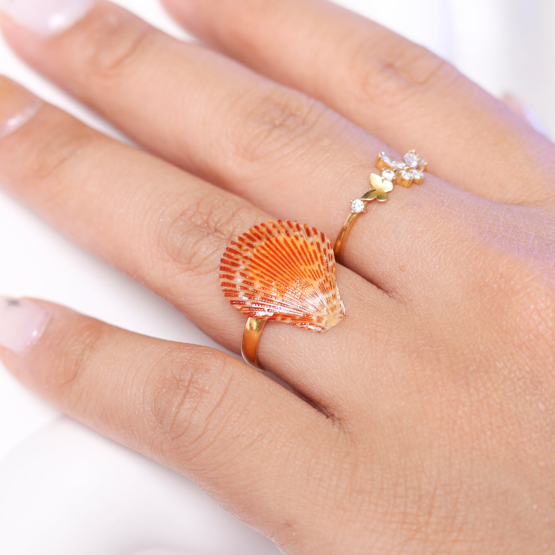 Add a splash of the sea to your look with this bold and beautiful shell ring. Featuring a real orange scallop shell on a gold-tone adjustable band, it’s the perfect piece for beach lovers, island girls, or anyone chasing that coastal glow. Size: 0.47''.